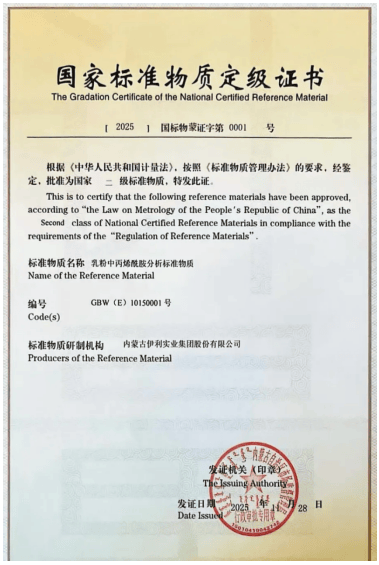 尺度物质是“丈量范畴的标尺”,是国度量值传送取溯源系统中的环节载体,普遍使用于科学研究、工业出产、监测、医疗卫生等范畴。伊利股份获得内蒙古自治区市场监视办理局颁布的全区首张二级尺度物质定级证书。这也是国度市场监管总局本年7月份核准将二级尺度物质行政审批权下放至内蒙古后,颁布的首张证书。