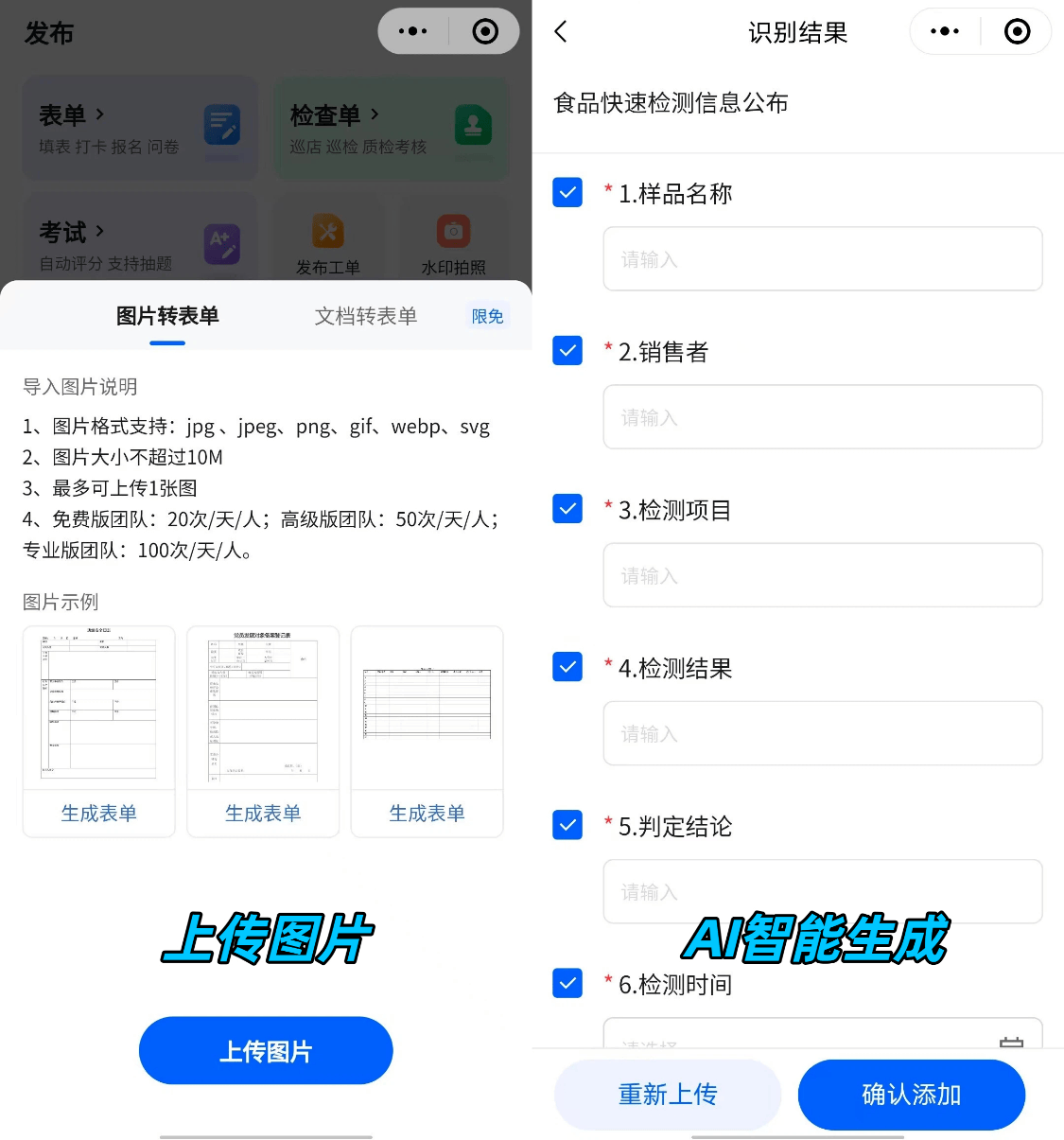 门店自查和督导放哨,环节是要有同一的食安查抄尺度。按尺度逐项查抄,才能客不雅反映各门店的平安程度。办理人只需上传现有的纸质查抄尺度表,1 分钟就能生成数字化查抄单。